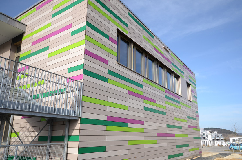 Eine bunte Welt für Tuttlinger Kinder: An diesem Kindergarten im Neubaugebiet in Tuttlingen haben wir auf 750 qm Fläche eine Fassade aus Trespa® Platten verbaut. Hier können sich zukünftig Kindergartenkinder aus der Umgebung wohlfühlen!